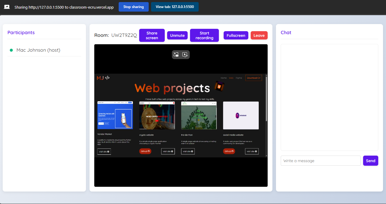 A simple classroom platfrorm to hold lectures or lessons with shared screen feature and in-built live chat. visit site